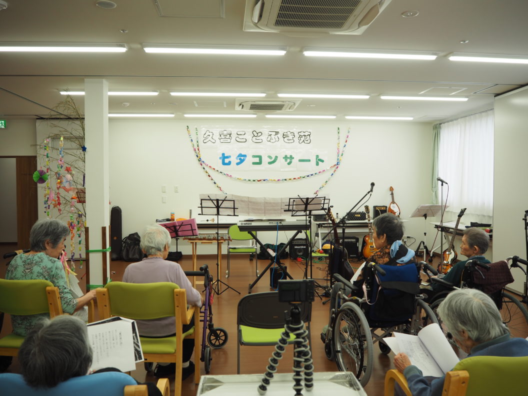 七夕コンサート 2019/07/07 OLYMPUS DIGITAL CAMERA 7月7日に「久喜ことぶき苑 七夕コンサート」を開催致しました。 職員有志のバンドが練習を重ね、大盛り上がりのコンサートとなりました。ご利用者様も手元の歌詞を見ながら口ずさんでいらっしゃいました。ご家族の方々もお忙しい中来苑くださり、ありがとうございました。 ブログ一覧へ