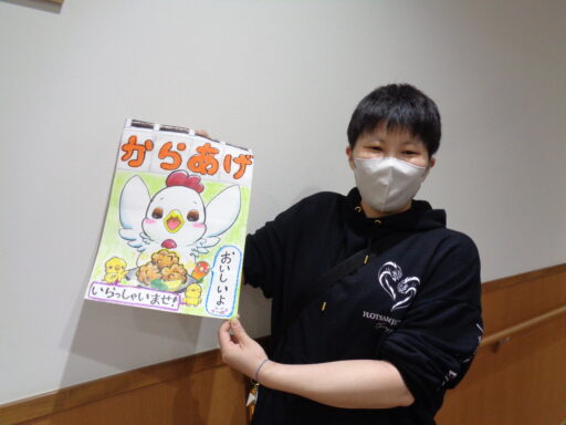 唐揚げの看板は手描きです。