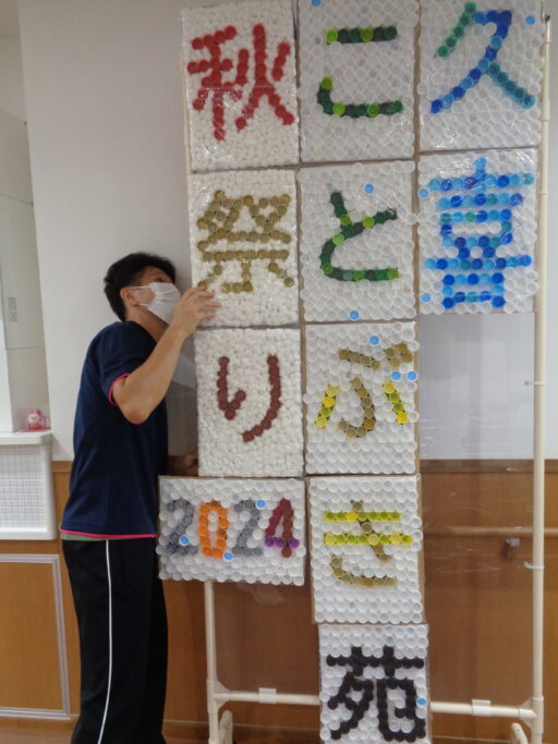 そして、秋祭りの看板はペットボトルキャップでできています!