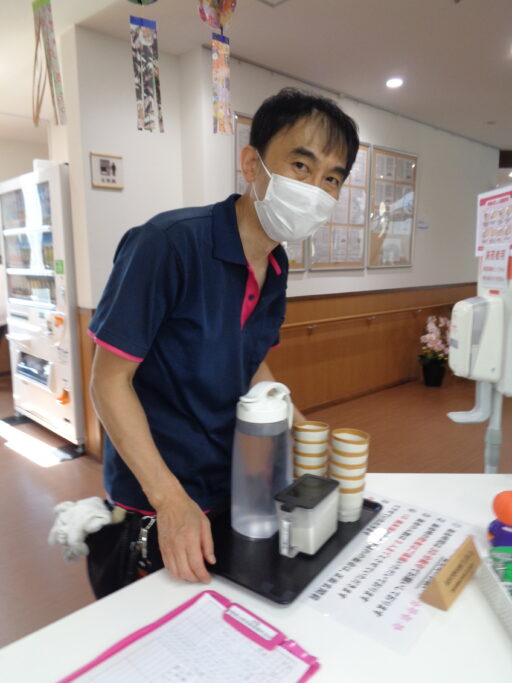 お食事の配膳をする相談員!ボーダーが素敵です!!