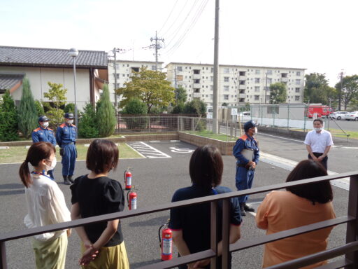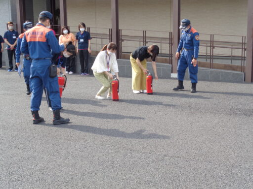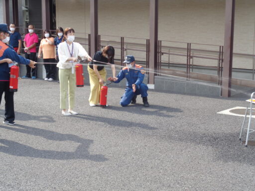 消防訓練 2023/09/20 「火事だー」 火災を想定しての消防訓練を実施しました。 水消火器で放水の訓練です。 レバーを持ち、黄色いピンをぬき、ホースをもって放水します。 消防士さんの丁寧な指導でとてもわかりやすかったです。 消防士さんのお話を聞き、本日の訓練は無事終了。 今年はまだまだ暑くて職員全員汗だくです💦 ひきつづき、ご利用者様の安全をお守りし、もしもの時は速やかに誘導ができるよう備えます。 ブログ一覧へ