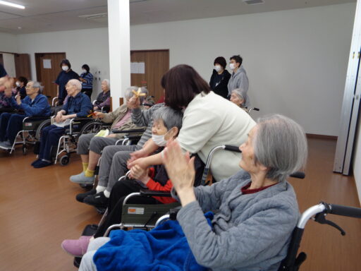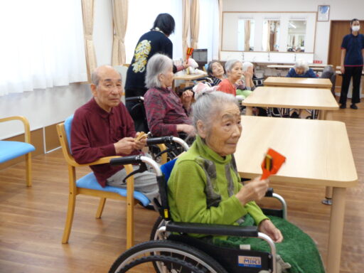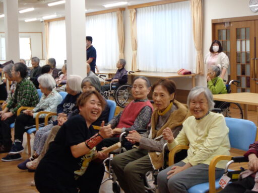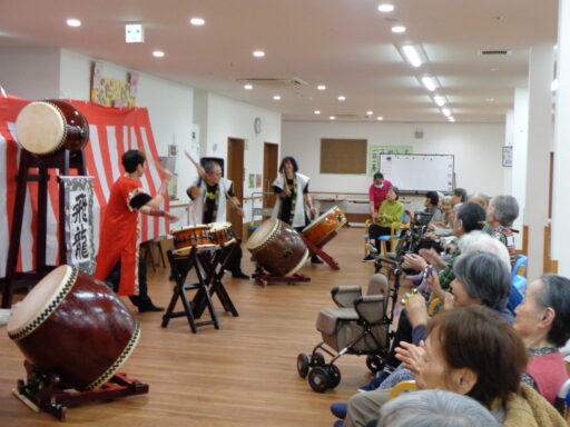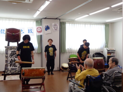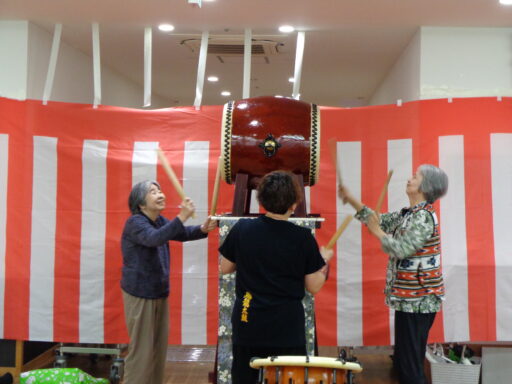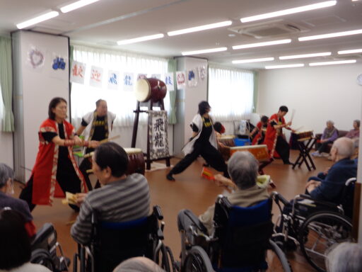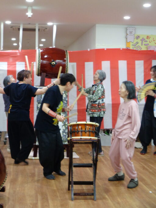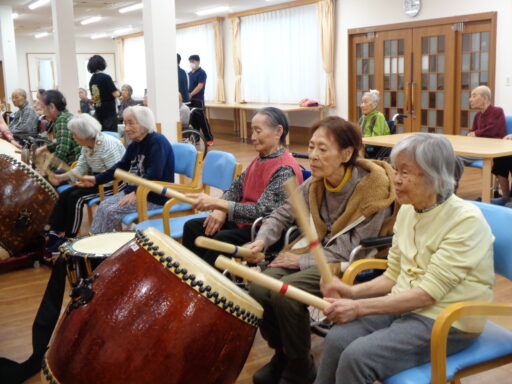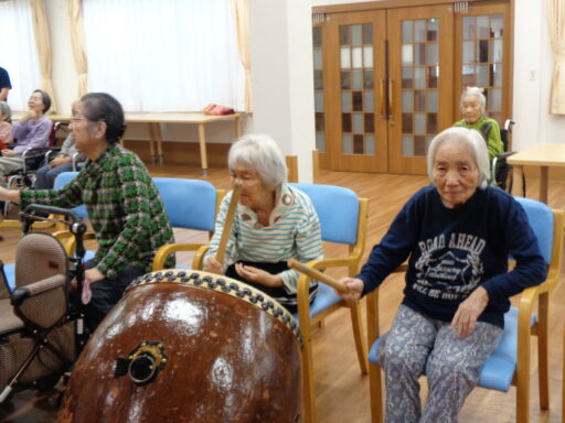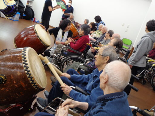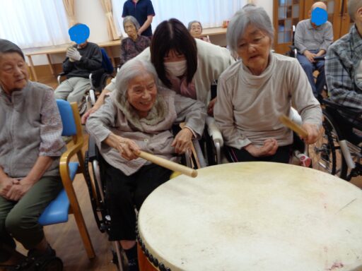 入居者様も初めて太鼓に触れた方がたくさんいらっしゃり、