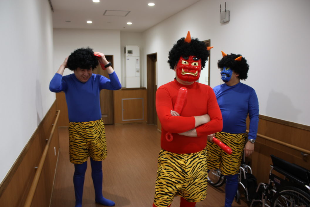 鬼が来た―っ! 2020/02/03 「鬼はそと~、福はうち~」 久喜ことぶき苑にも赤鬼と青鬼が現れました! 利用者の皆様も職員も、楽しく豆まきを行いました。 節分に使用した豆は、「大宮公園小動物園」に寄贈いたしました。 ブログ一覧へ