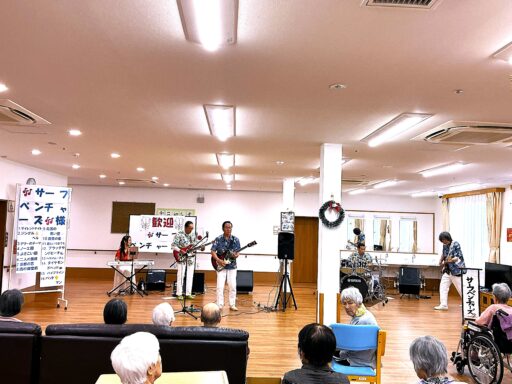 🎸サーフベンチャーズ🎸様🎶Xmas🎄ボランティアコンサート🎶12/3(水) 2025/12/23 本日は昨年も同じ時期にお越し頂いた🎸サーフベンチャーズ様🎸 にXmasコンサートを開催していただきました👏👏 🎸ギター🎸の音量と🥁ドラム🥁の迫力に 入居者の皆様もノリノリ💕💓💕 曲目は先ず始めにXmas🎄ソング🔔 エレキ🎸の若大将 加山雄三の曲や 民謡なども入れて頂き音楽の🎼の楽しいひと時でした✨✨ 次回は来年の『秋🍂祭り』の野外ステージで再来苑くださる事 お待ちしております🌈 💝💛💝本日は誠にありがとうございました💝💛💝 ブログ一覧へ